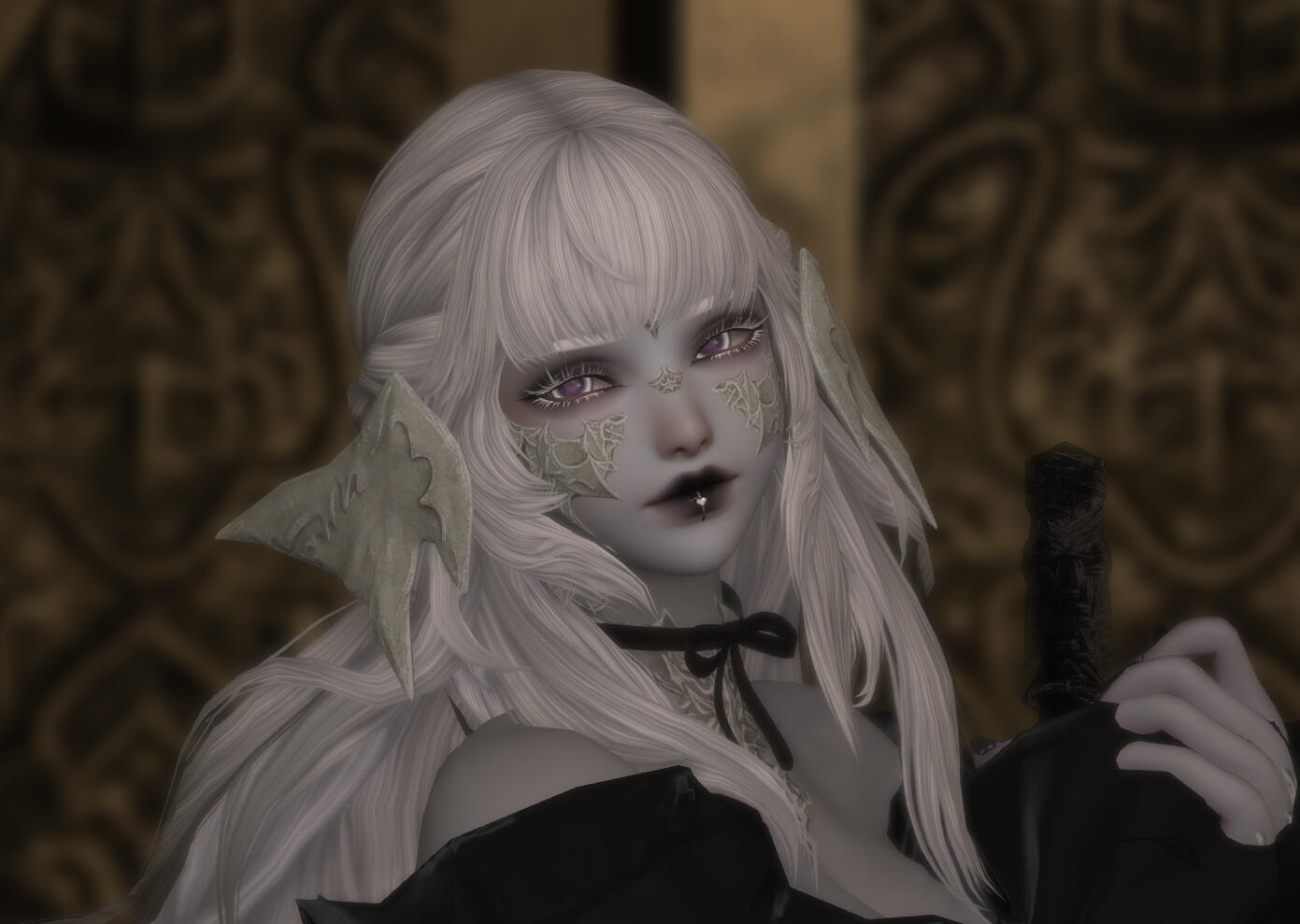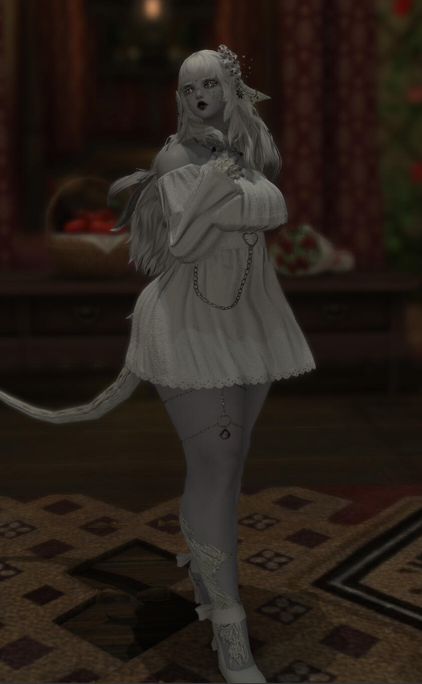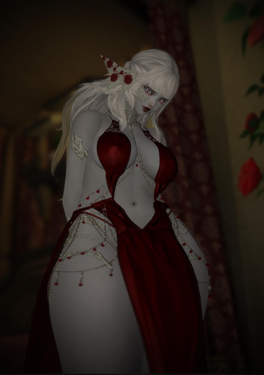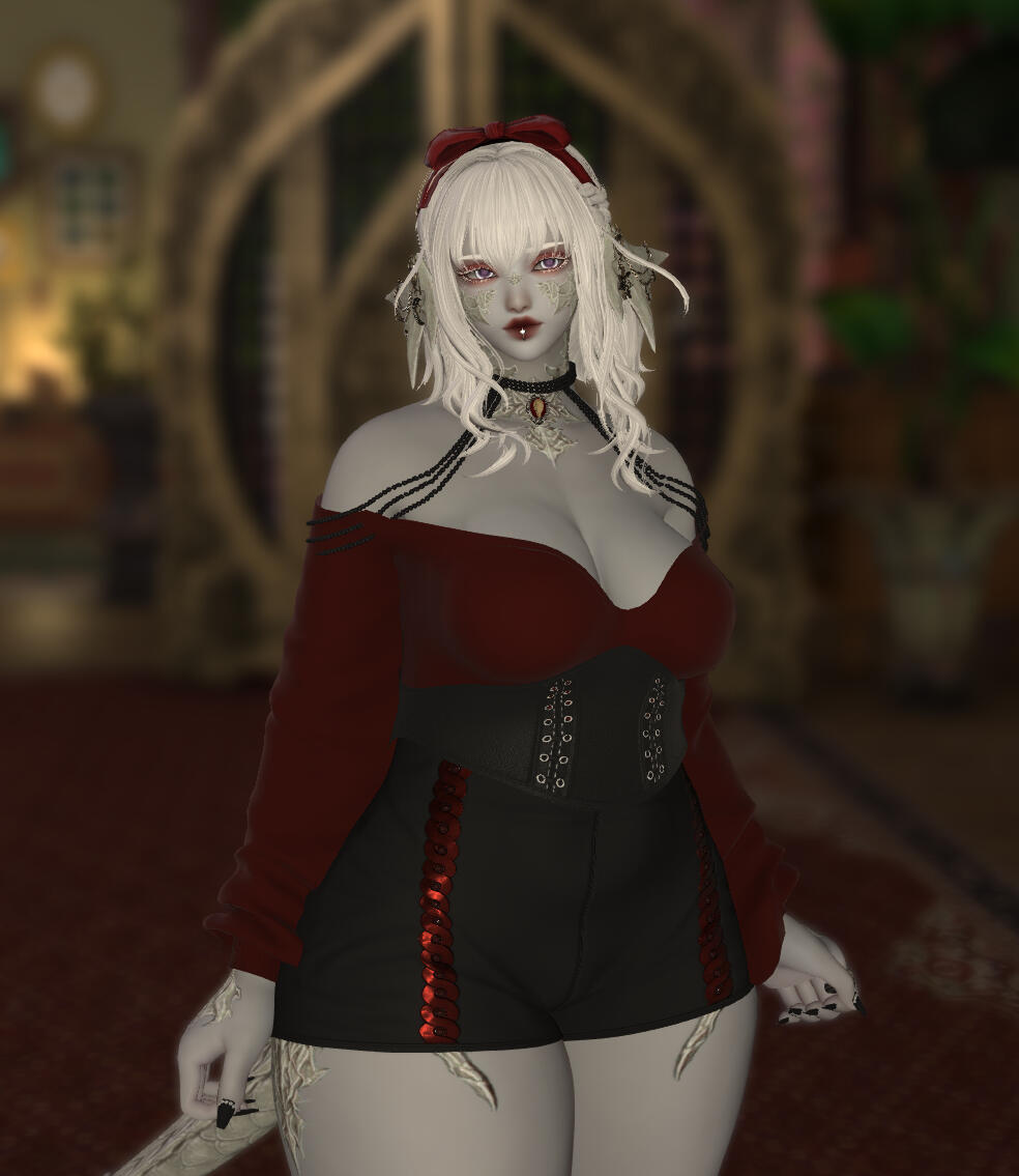 Bows, lace, satin, and silk. All paint a delicate picture of soft grace. Iwa Akagane is nothing if not soft and graceful - but she is far from delicate, no matter how she might look. With coloring reminiscent of a cloudy and snowy day, the short raen holds herself with the same soft silence as falling snow. Though one might be reminded of a wintery chill when thoughts of snowy days come to mind, they would not find any sort of coldness with Iwa.She is a warm and bright woman who smiles easily. The smiles may be small and timid, but they are present nigh constantly on her rounded face. More exuberant or flamboyant expressions are swiftly tamped down, replaced with something far more demure and meek. Though they may be chased away for the most part, the warm expressions never truly leave black or red painted lips.Snowy tresses brush against her shoulders in a long bob. A v-shaped fringe and curls frame Iwa's face, their pale shade bringing out the stark white of long eyelashes. Though she often paints her eyelids with dark red pigment to match her lips, she leaves her lashes bare to stand in contrast with the deep shadow.Her scales, similar in color to her alabaster hair, are often polished with an oil that carries in it a hint of color. Her scales reflect a faint amethyst shimmer to gleam along with pearlescent angles. The horns of her head are decorated with delicate chains and tiny crystals that reflect the light. Iwa's eyes are similar in hue, being lavender with white limbal rings framing the delicate color.Scars, still new, spiderweb from the outer corners of her eyes. Said scars travel to the scales on her cheek, the injury having shattered some of the delicate patterning there.Iwa's attire leans towards midnight blacks and deep reds, all of which contrast sharply with her pale grey skin tone. She has a generously curved figure that is closer to chubby or voluptuous, and she is not afraid to highlight her assets with tight lace and silk corsets. Though shy in demeanor, her attire is often a contradiction to this, likely due to her chosen profession.Her long tail often sways in a rhythmic motion behind her, the end of it tipped with a tied bow. The length of her tail reaches her ankles, remaining just an ilm or two free from touching the ground. She often keeps it curled up at the tip, just to be safe. The appendage is as expressive as a miqo'te's ears - often curling around her legs or twitching depending on her moods. As if that were not enough, she wears her expressions without restriction. It is often easy to tell how she is feeling or what she is thinking.
